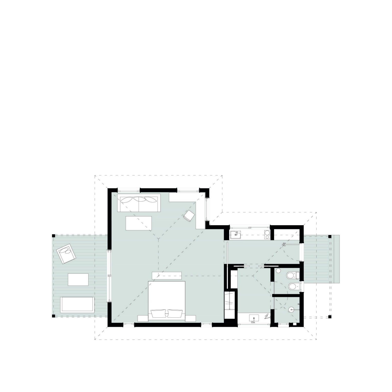 En esta fase del proyecto, continuamos desarrollando suites para un hotel de campo en el club de polo. La propuesta consiste en dos cabañas gemelas que ofrecen refugio independiente, articulando visuales entre el lago y el bosque, y asegurando la intimidad de sus huéspedes.