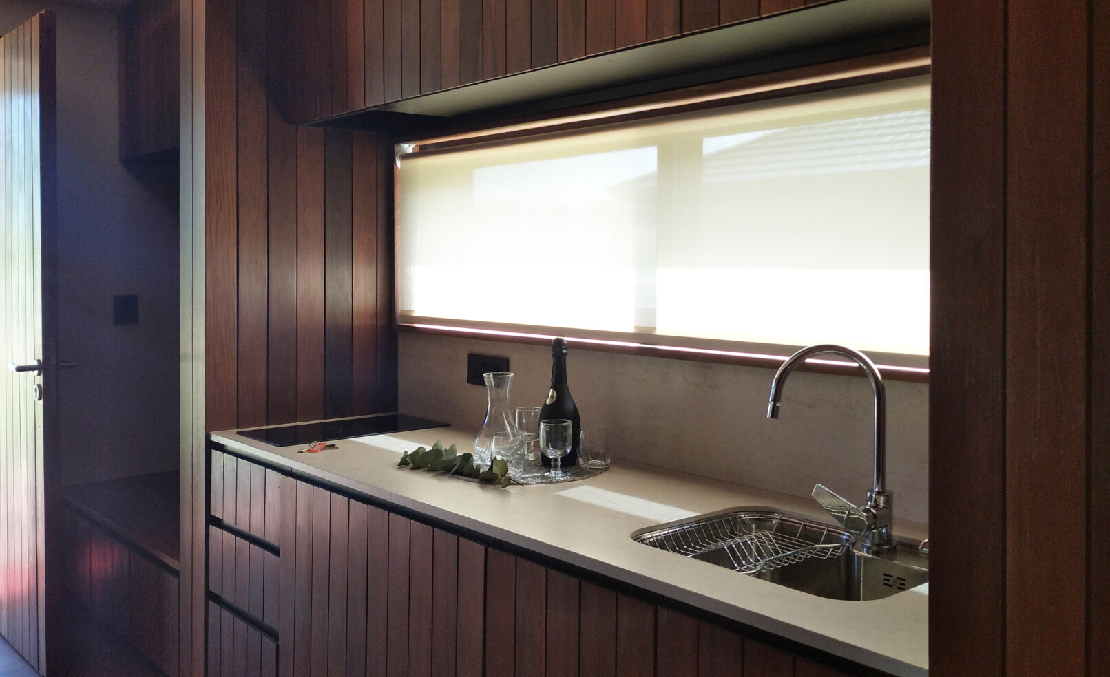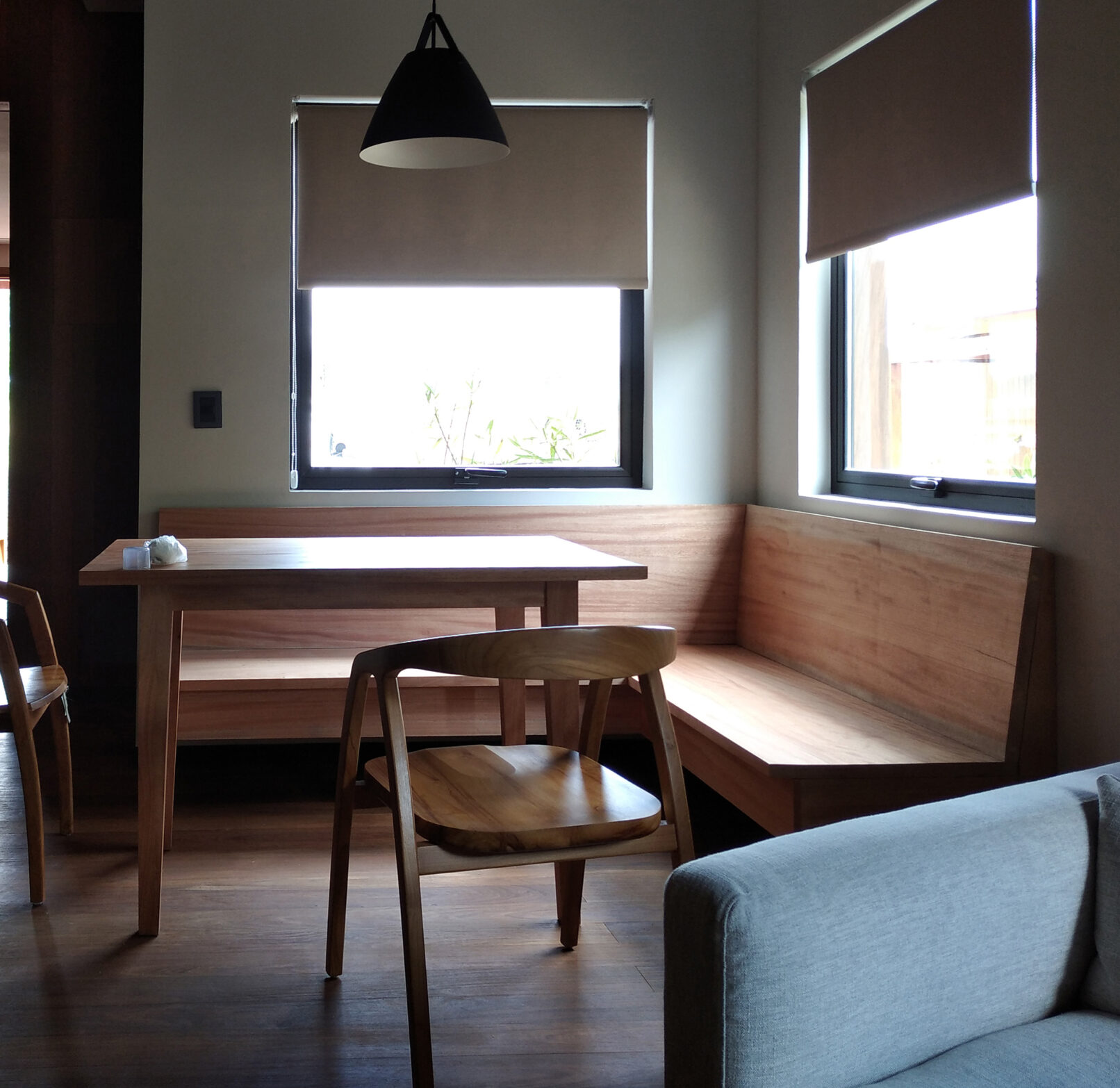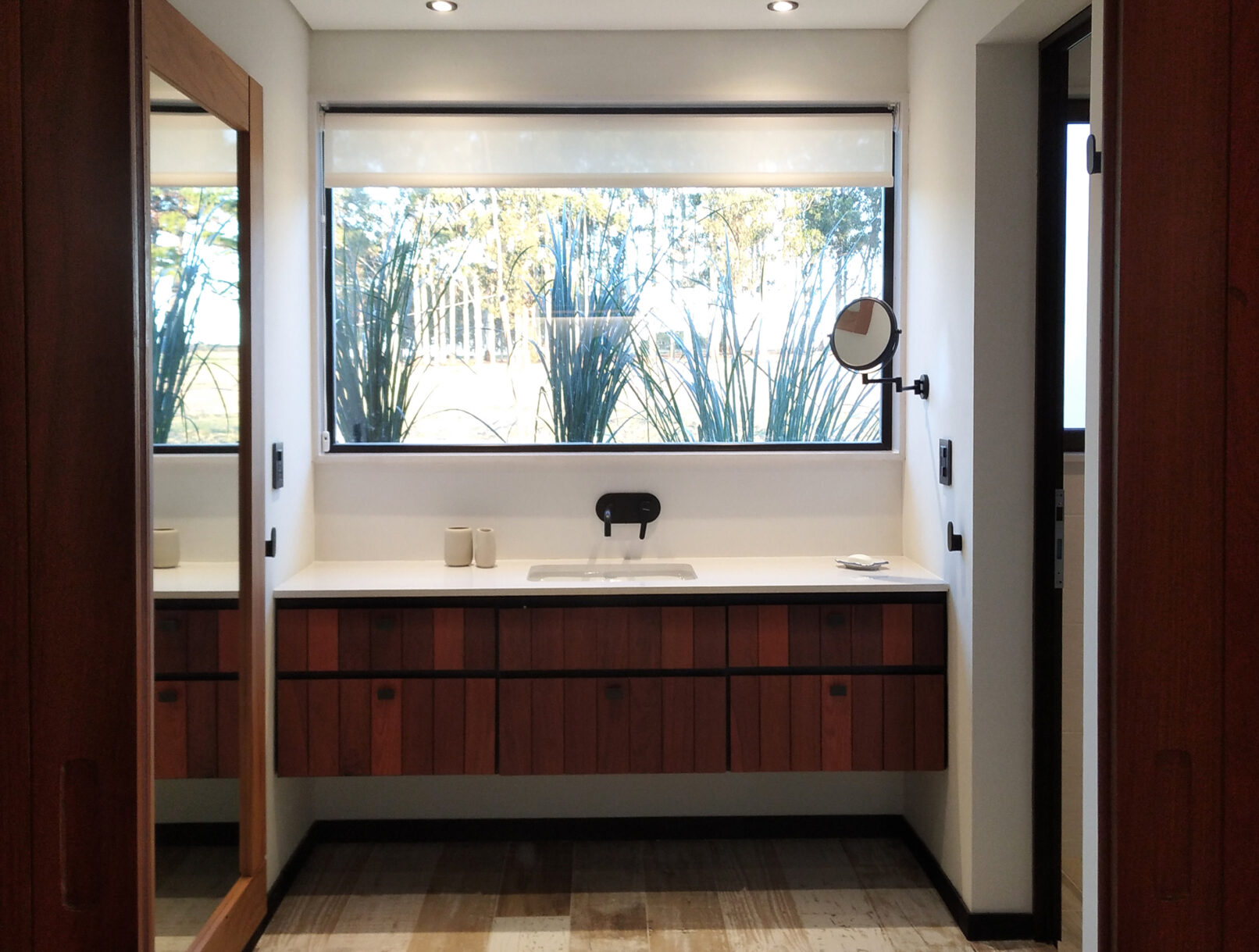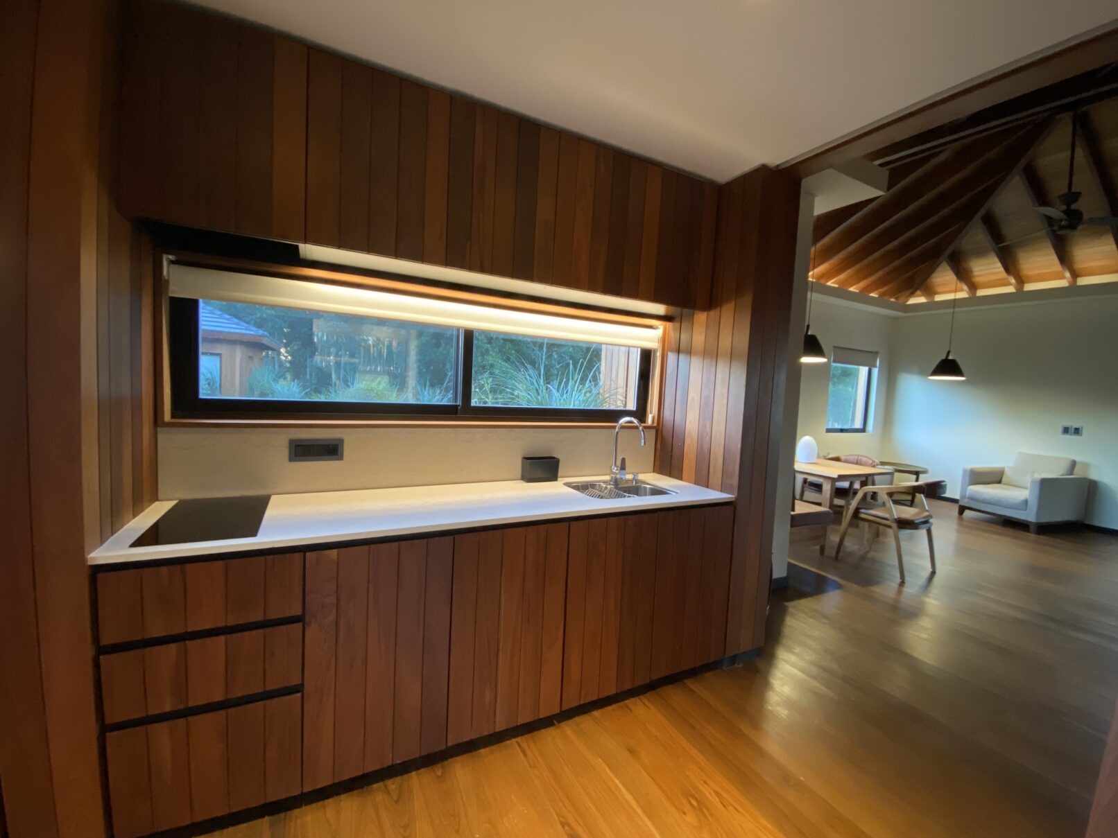 Se eligió un revestimiento exterior de madera lapacho, con cubiertas piramidales de teja cerámica plana negra y aberturas de aluminio negro. En el interior, se trabajó con revestimientos de madera maciza para paredes, equipamiento, pisos y cielorrasos, creando una atmósfera cálida y acogedora.