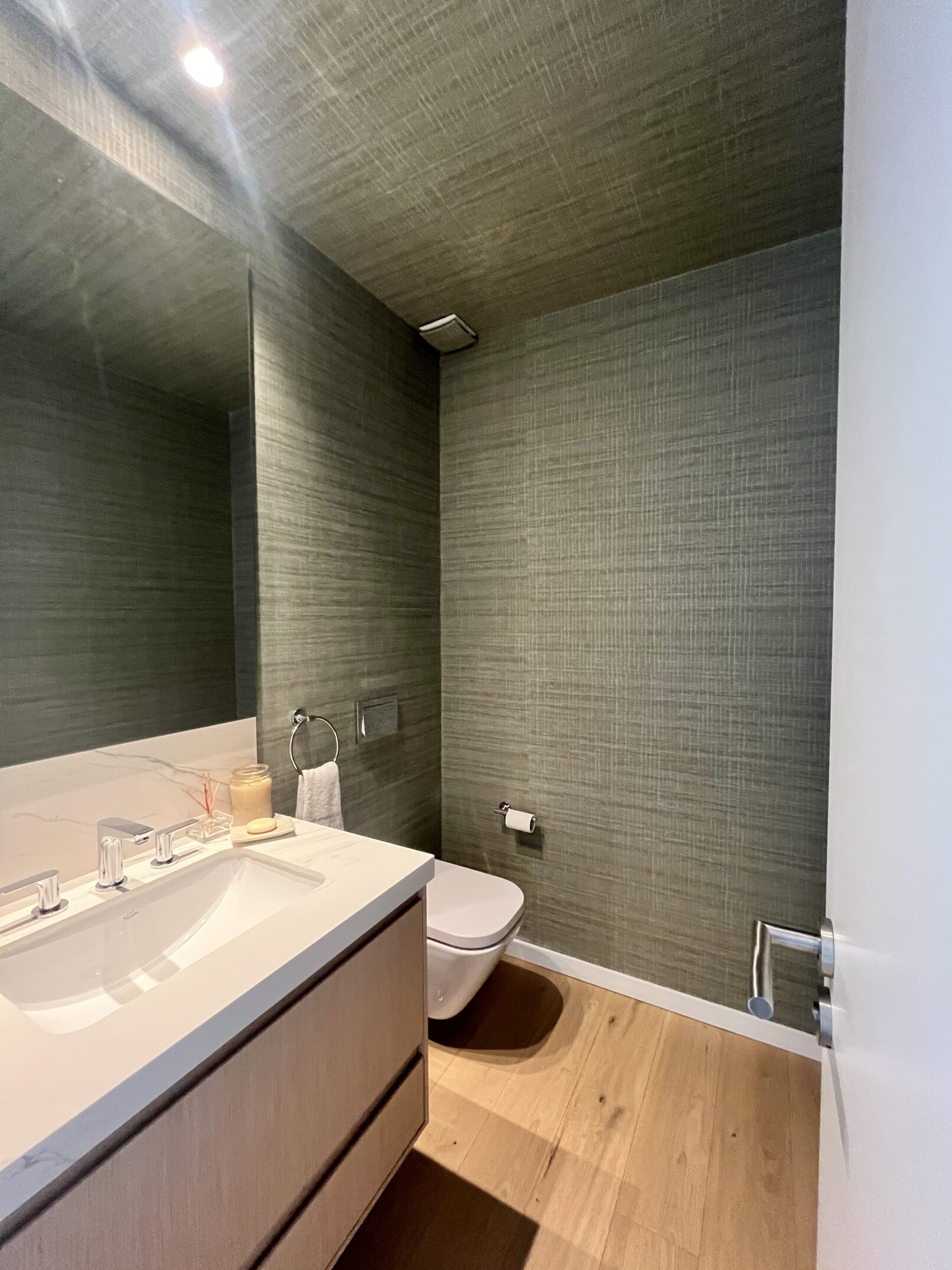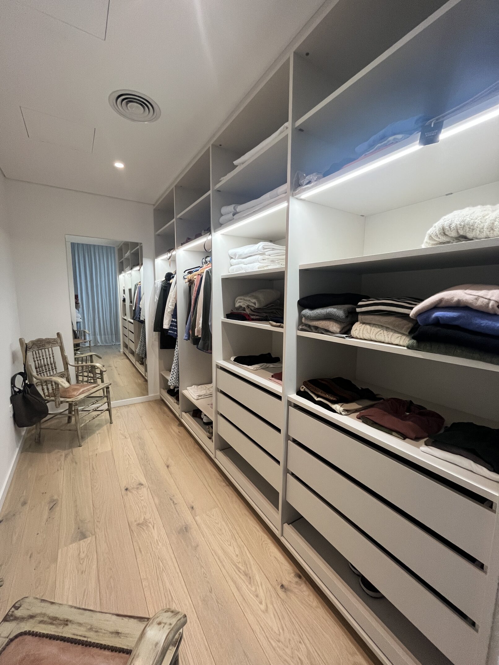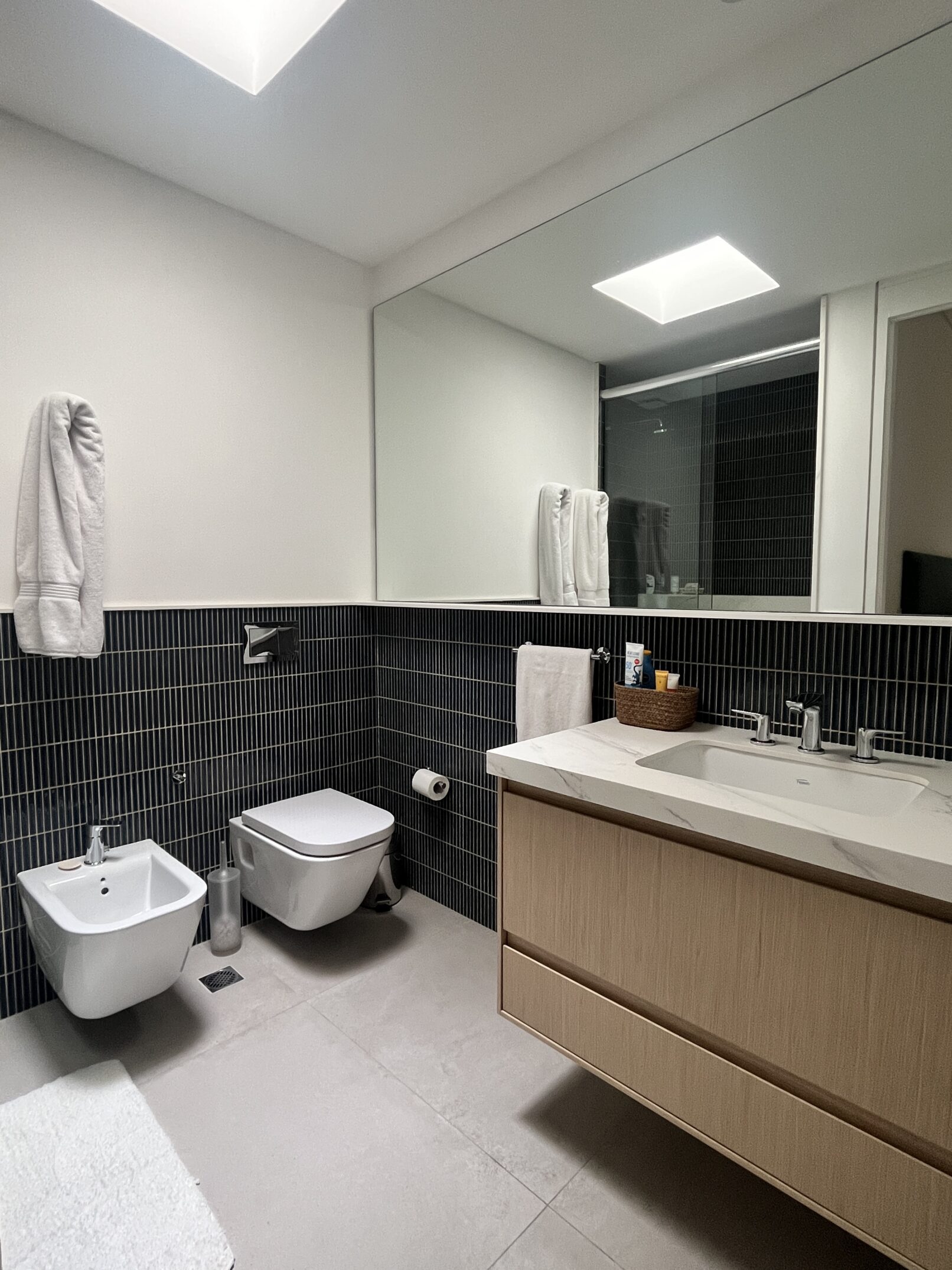 Se intervino en aproximadamente el 50% del área del apartamento, realizando un cambio completo de instalaciones y terminaciones en ese sector. Se reformaron dos dormitorios en suite, incluyendo una principal, y se renovaron la cocina y los baños, incorporando revestimientos modernos y equipamientos de alta calidad. Los pisos fueron reemplazados por materiales de última generación, como piso de madera de ingeniería y porcelanato, y se instalaron electrodomésticos panelables. Se utilizaron colores atrevidos y se diseñaron equipamientos a medida para maximizar la funcionalidad y el estilo del espacio.