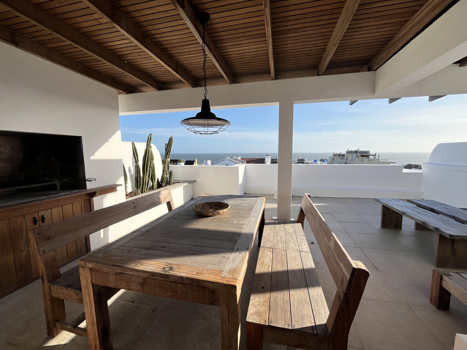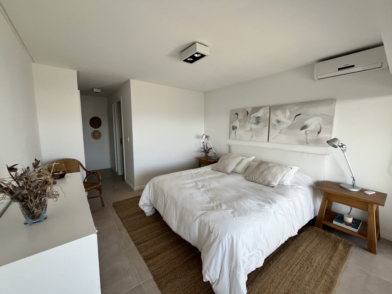 El diseño interior se caracteriza por una paleta de colores cálidos y una imagen limpia, sin carga ornamental, creando un ambiente relajado y acogedor, ideal para un apartamento de verano. La terraza ofrece vistas panorámicas, integrándose al conjunto como un espacio adicional de disfrute.